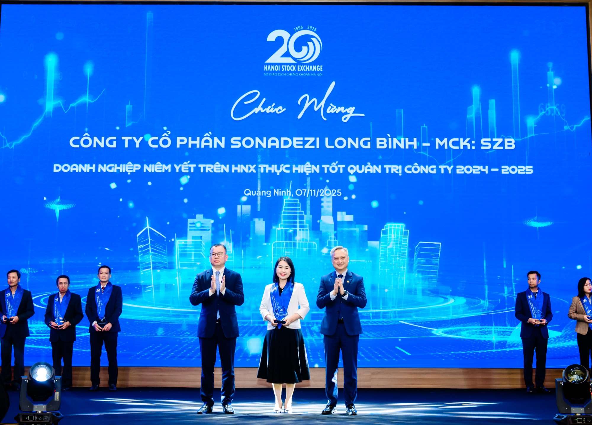 Công ty Cổ phần Sonadezi Long Bình (HNX: SZB) vinh dự nhận giải thưởng “Doanh nghiệp niêm yết trên HNX thực hiện tốt quản trị công ty” trong kỳ đánh giá năm 2024-2025 do Sở Giao dịch Chứng khoán Hà Nội (HNX) trao tặng tại Hội nghị Doanh nghiệp thường niên năm 2025.